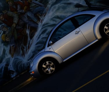 The murals which adorn Sidney are quite exquisite and for the most art I think go unnoticed as we go about our daily inhabitant lives. But they are there and they are big.This one on the side of Fairways Market always provides me with juxtapositional fun as cars park alongside it. This German made automobile has never been a favourite but on this day the nocturnal nuances altered my conscious perception and a dutch angle gave me just what I wanted.