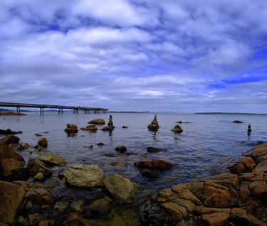 Falling upon an unusual scene, man made or otherwise can be a wonderful surprise. Sidney’s coastline, walkways and parks are full of opportune moments for those that endeavour to explore and discover its secrets. It was mid summer when I stumbled upon this rather bizarre collection of Inukshuks. The light was full and blazing which is usually a caveat to put the camera back in its case, but not this time. Water subjects with rocks doused in strong light benefit from this kind of luminosity. Strong colours are emitted and a wonderful surreal saturation ensues. That is half the story, one also needs a compliment of light in the sky with high contrast clouds, on this particluer day the weather system was just perfect to augment the framing of the rocky assemblies.